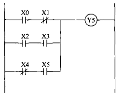 正确答案:参考一:|0 LD X0|1 ANI X1|2 LD X2|3 AND X3|4 ORB|5 LDI X4|6 AND X5|7 ORB |8 OUT Y5|参考二:|0 LD X0|1 ANI X1|2 LD X2|3 AND X3|4 LDI X4|5 AND X5|6 ORB|7 ORB|8 OUT Y5