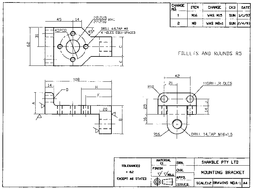 |回答表中问题。1、此件要钻几个孔?2、此件总高是多少?|3、尺寸A是多少?4、M8螺纹攻丝前的尺寸是多少?|5、尺寸B是多少?6、此件公差有何规定?|7、尺寸C是多少?8、M16螺孔属于什么系列?|9、尺寸E是多少?10、孔D直径是多少?|11、尺寸F是多少?12、要镗的孔公差是多少?|13、PCD是什么意识?14、此件表面粗糙度有何要求?|15、内外圆角半径是多少?16、尺寸H是多少?|17、此件上有多少螺孔?18、尺寸J是多少?|19、有多少个表面要机加工?20、此图是第几角投影?