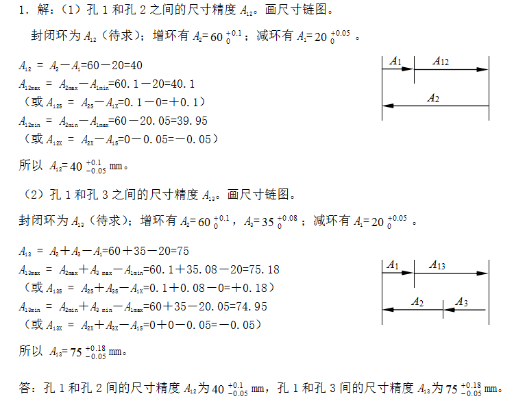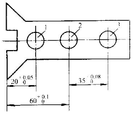 2、(主观题)如图所示的零件,加工三个孔,计算加工后孔1和孔2之间、孔1和孔3之间所能达到的尺寸精度,并画出尺寸链图。