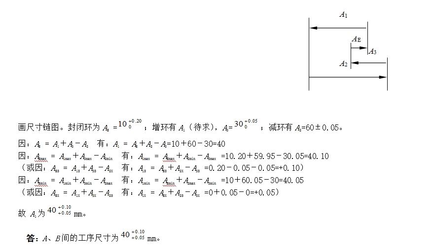 19、(主观题)如图所示的轴套件,当加工B面保证尺寸mm时的定位基准为A时,需进行工艺尺寸换算。试计算A、B间的工序尺寸,并画出尺寸链图。