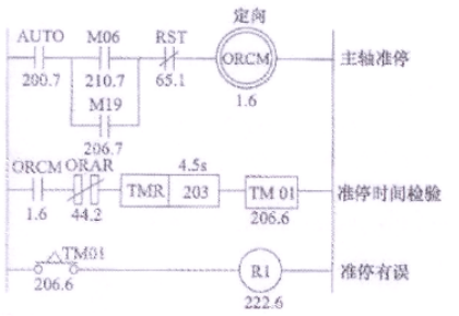 正确答案:1、控制主轴准停有两个主要信号,一个是M06——换刀指令信号,另一个是主轴准停控制指令信号,这两个信号并联作为主轴准停控制的主令信号,只要其中一个信号动作。就能控制主轴作准停运动。|2、AUTO为自动工作方式状态信号,手动时AUTO为“0”,自动时为“1”;RST为CNC系统的复位信号;ORCM为主轴准停继电器,其触点输出到机床以控制主轴准停;ORAR为从机床侧输入的“准停到位”信号;TMR进行定时操作,检测主轴准停是否在规定时间内完成,整定时间限制为4.5s;R1为报警继电器。