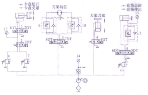 11、(主观题)图示为MJ-50数控车床液压系统的原理图,简述卡盘分系统的工作原理。|