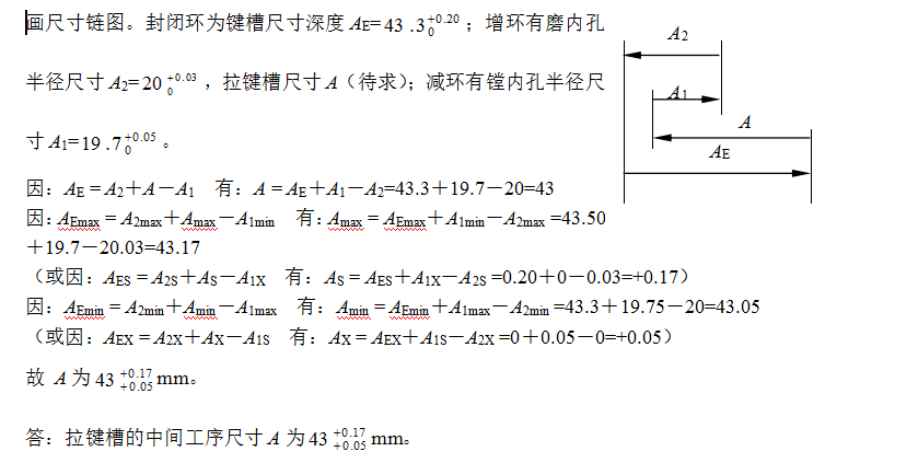 30、(主观题)图示圆柱齿轮,内孔需淬硬及磨削,孔径为φmm,键槽深度尺寸为mm。若加工工序顺序为:(1)镗内孔至φmm;(2)拉键槽至尺寸A;(3)热处理;(4)磨内孔至尺寸φmm。由于热处理后内孔的尺寸变形很小,可忽略不计,为了保证键槽尺寸深度mm,计算拉键槽的中间工序尺寸A,并画出尺寸链图。