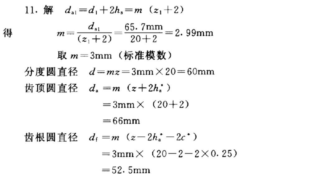 4、(主观题)修配一个已损坏的齿数为20的标准直齿圆柱齿轮。实测得齿顶圆直径约为65.7mm,试确定该齿轮的主要尺寸。